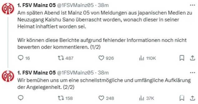 “今天深夜,美因茨俱乐部看到日本媒体报道佐野海舟在国内遭到逮捕的消息,我们对此感到震惊。由于缺乏信息,我们无法对这些报道进行评估或发表评论,我们正尝试尽可能快地,尽可能全面地了解事件。”