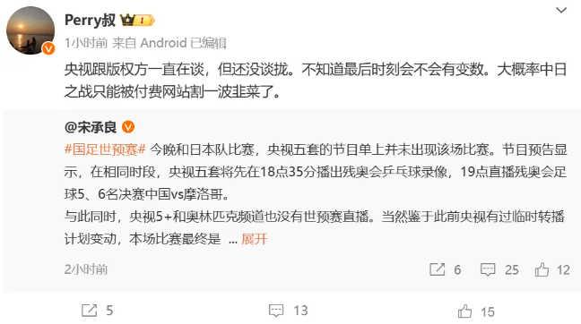搜狐体育记者裴力转发回复表示:“央视跟版权视频网站一直在谈,但还没谈拢,不知道最后时刻会不会有变数。大概率中日之战只能被付费网站割一波韭菜了。”